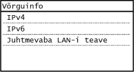 Kuvatakse võrguseaded (nt seadme IP-aadress) ja võrguolek (nt traadita side kohtvõrgu ühenduse seisund).