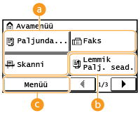 Ekraanil kuvatakse <Avamenüü>, kus saate käivitada toiminguid ja täpsustada sätteid. Saate seal vaadata ka töö edenemist ja teateid. Ekraani kasutamiseks puudutage seda.