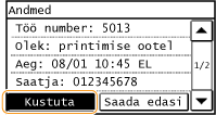 Saate printida vastuvõtuaruanded iga kord, kui dokumendid talletatakse mällu. Aruannete printimiseks puudutage käsku <Sees>. Lisaks peate seade <RX-i tulemuste aruanne> väärtuseks määrama <Sees>.