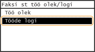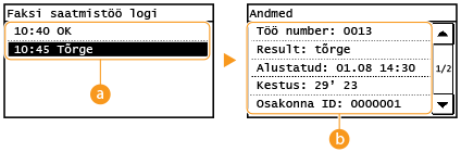 ![]() <Faksi saatmistöö logi>/<Faksi vastuvõtutöö logi>Kuvatakse saadetud ja vastuvõetud dokumentide loend. <OK> kuvatakse dokumendi eduka saatmise või vastuvõtu korral ja <Tõrge> kuvatakse siis, kui dokumendi saatmine või vastuvõtt nurjus tühistamise või tõrke tõttu.