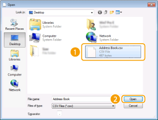 Faksidraiverisse saab importida kolme tüüpi faile: CSV-faile (*.csv), Canoni aadressiraamatu faile (*.abk) ning seadme seadeväärtuste teabe faile (*.dcm).
