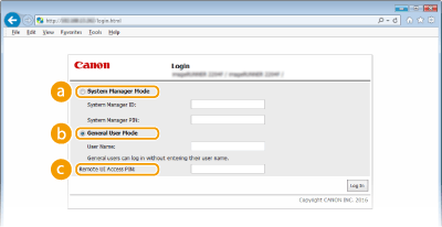 Saate teha kõiki tarkvara Remote UI (Kaugkasutajaliides) toiminguid ja määrata kõiki seadeid. Sisestage väljale [System Manager ID] sobiv ID ja väljale [System Manager PIN] (