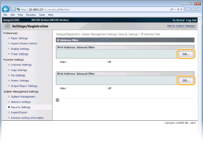 Kui IP-aadressid sisestatakse valesti, ei pruugi te Remote UI (Kaugkasutajaliides) kaudu seadmega juurdepääsu saada. Sel juhul peate seadma valiku <IPv4-aadressi filter> või <IPv6-aadressi filter> väärtuseks <Väljas>. IPv4-aadressi filter IPv6-aadressi filter