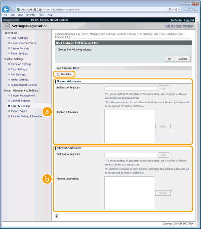 Lubab side loomise ainult nende seadmete jaoks, mille IP-aadressid on sisestatud jaotisse [Allowed Addresses] ja keelab side loomise muude IP-aadressidega seadmete jaoks. Sellegipoolest takistatakse side loomist nendelt IP-aadressidelt, mis on registreeritud ka jaotises [Blocked Addresses].