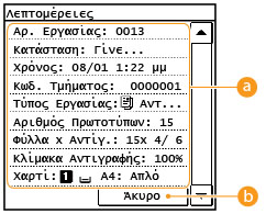 Εμφανίζονται ο αριθμός αντιγράφων, οι ρυθμίσεις και άλλες λεπτομέρειες. Εάν θέλετε μόνο να ελέγξετε τις λεπτομέρειες χωρίς να ακυρώσετε την αντιγραφή, πατήστε