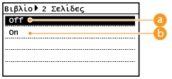 2 σελίδες > δεν είναι διαθέσιμη όταν χρησιμοποιείτε την επιλογή <2-Όψεις>, <2 σε 1>/<4 σε 1>, <Αντιγραφή Ταυτότητας>, ή <Πρωτότυπα Διαφορ. Μεγέθους>. |