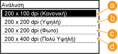 Μπορείτε να επιλέξετε την κατάλληλη ανάλυση για τον τύπο του εγγράφου. Όσο υψηλότερη είναι η ανάλυση τόσο πιο ευκρινής είναι η εικόνα, αλλά και τόσο περισσότερο διαρκεί η αποστολή της.