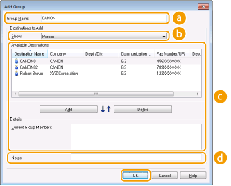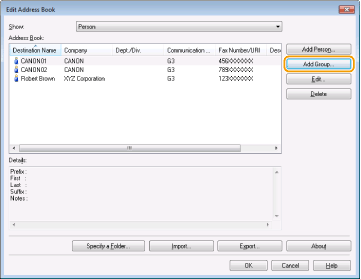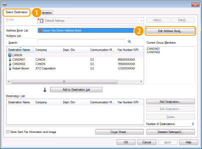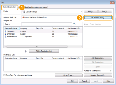 Στην ενότητα αυτή περιγράφεται ο τρόπος καταχώρισης προορισμών στο βιβλίο διευθύνσεων για φαξ που αποστέλλονται από υπολογιστή. Μπορείτε να επιλέξετε μεμονωμένους προορισμούς από τους προορισμούς που είναι καταχωρισμένοι στο βιβλίο διευθύνσεων, ώστε να δημιουργήσετε έναν ομαδικό προορισμό (Ομαδική κλήση), κάτι που είναι χρήσιμο κατά την ταυτόχρονη αποστολή σε πολλούς προορισμούς.