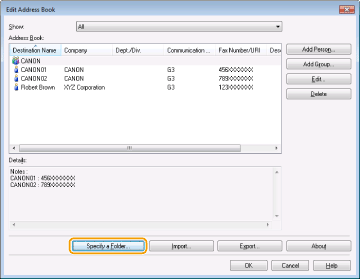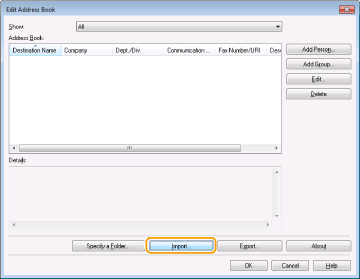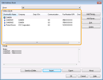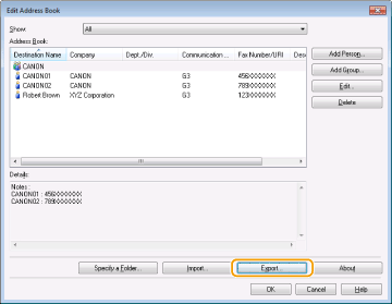 Υπάρχει δυνατότητα εισαγωγής δεδομένων Βιβλίου Διευθύνσεων σε μορφή CSV, τα οποία έχουν δημιουργηθεί σε εφαρμογές όπως το Microsoft Excel, καθώς και η εξαγωγή δεδομένων του Βιβλίου Διευθύνσεων σε ένα αρχείο για χρήση σε άλλες συσκευές φαξ ή εφαρμογές.
