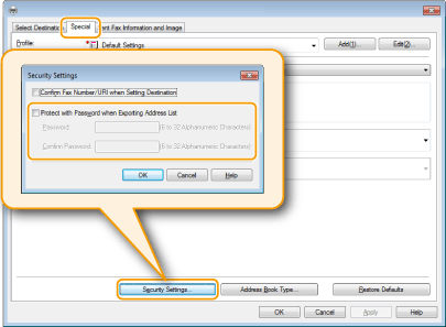 Αν έχετε επιλέξει [Protect with Password when Exporting Address List] (Προστασία με συνθηματικό κατά την εξαγωγή λίστας διευθύνσεων) στο παράθυρο διαλόγου που εμφανίζεται όταν επιλέξετε [Security Settings] (Ρυθμίσεις ασφαλείας) στην καρτέλα [Special] (Ειδικές), εμφανίζεται ένα πλαίσιο διαλόγου για την εισαγωγή συνθηματικού, όταν κάνετε κλικ στο κουμπί [Export] (Εξαγωγή). Για περισσότερες πληροφορίες, κάντε κλικ στο [Help] (Βοήθεια) στην οθόνη του προγράμματος οδήγησης φαξ.