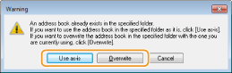 Αν υπάρχει ήδη βιβλίο διευθύνσεων στο φάκελο που επιλέξατε στο βήμα 4, θα εμφανιστεί το παρακάτω μήνυμα. Αν θέλετε να χρησιμοποιήσετε το υπάρχον βιβλίο διευθύνσεων, επιλέξτε [Use as-is] (Χρήση ως έχει). Εάν θέλετε να χρησιμοποιήσετε το βιβλίο διευθύνσεων του προγράμματος οδήγησης φαξ, επιλέξτε [Overwrite] (Αντικατάσταση).