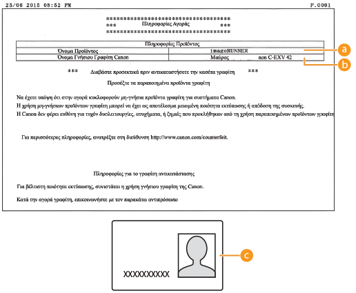 Χρησιμοποιήστε αυτήν τη διαδικασία για να εκτυπώσετε τις πληροφορίες αγοράς για αναλώσιμα. Εκτυπώνονται τα ακόλουθα στοιχεία: