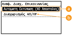 Πατήστε <On> για να εκτυπώνονται ξεχωριστά οι αναφορές απεσταλμένων και ληφθέντων εγγράφων ή <Off> για να εκτυπώνονται και οι δύο αναφορές σε ένα φύλλο.