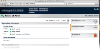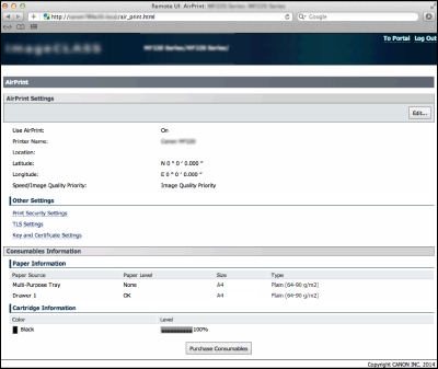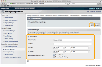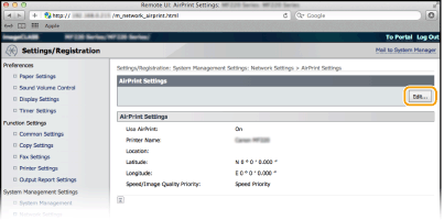 Μπορείτε να καταχωρίσετε τις πληροφορίες, συμπεριλαμβανομένων του ονόματος της συσκευής και της τοποθεσίας εγκατάστασης, που χρησιμοποιούνται για την ταυτοποίηση της συσκευής. Επίσης, μπορείτε να απενεργοποιήσετε τη λειτουργία AirPrint στη συσκευή. Χρησιμοποιήστε τη λειτουργία Remote UI (Απομακρυσμένο περιβάλλον εργασίας) για να αλλάξετε αυτές τις ρυθμίσεις.