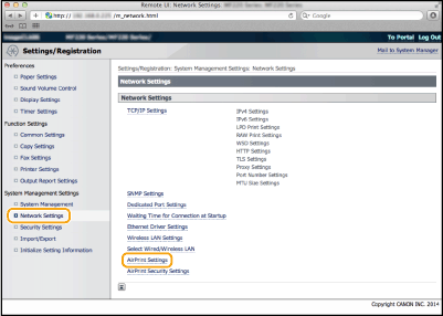 Εάν θέλετε να απενεργοποιήσετε τις λειτουργίες που δεν πρόκειται να χρησιμοποιηθούν με τη λειτουργία AirPrint ή να κρυπτογραφήσετε τη μετάδοση δεδομένων, επιλέξτε την κατάλληλη ρύθμιση μέσω του πίνακα ελέγχου.