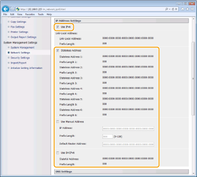 Οι διευθύνσεις IPv6 της συσκευής μπορούν να διαμορφωθούν μέσω του Remote UI. Πριν καθορίσετε διευθύνσεις IPv6, ελέγξτε τις ρυθμίσεις διευθύνσεων IPv4 (Προβολή ρυθμίσεων IPv4). Για να χρησιμοποιήσετε διευθύνσεις IPv6, πρέπει να ορίσετε τις σωστές διευθύνσεις IPv4. Έχετε υπόψη ότι η λειτουργία σάρωσης που χρησιμοποιεί το πρόγραμμα οδήγησης σαρωτή ή το MF Toolbox δεν είναι διαθέσιμη σε περιβάλλον IPv6. Η συσκευή μπορεί να χρησιμοποιήσει έως εννέα από τις παρακάτω διευθύνσεις IPv6: