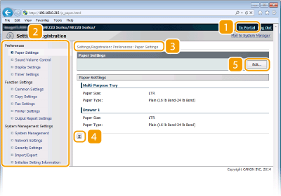Εμφανίζει τη σελίδα [Settings/Registration]. Όταν έχετε συνδεθεί στη λειτουργία υπεύθυνου συστήματος, μπορείτε να αλλάξετε τα στοιχεία ρύθμισης και να αποθηκεύσετε/φορτώσετε τα καταχωρισμένα δεδομένα.