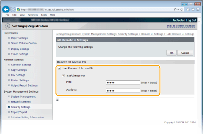Επιλέξτε το πλαίσιο ελέγχου [Use Remote UI Access PIN] και ορίστε τον κωδικό ΡΙΝ.