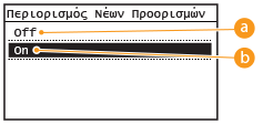 Περιορίζοντας τους αριθμούς φαξ που μπορούν να καθοριστούν για την αποστολή φαξ σε αυτούς που είναι ήδη καταχωρημένοι στα πλήκτρα μνήμης και στους κωδικούς μνήμης, μπορείτε να μειώσετε τις πιθανότητες να επιλέξετε λανθασμένο προορισμό και να εμποδίσετε τη διαρροή πληροφοριών από άλλους χρήστες. Όταν η λειτουργία αυτή είναι ενεργοποιημένη, η συσκευή δεν επιτρέπει στους χρήστες την εισαγωγή προορισμών με τη χρήση των αριθμητικών πλήκτρων, την προσθήκη νέων καταχωρίσεων στο Βιβλίο Διευθύνσεων και την επεξεργασία των υπαρχουσών καταχωρίσεων στο Βιβλίο Διευθύνσεων.