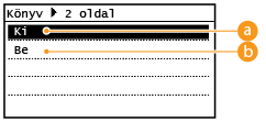 2 oldal> funkció nem érhető el a <2 oldalas>, <2-ről 1-re>/<4-ről 1-re>, <Azonosítókártya-másolás> vagy <Eltérő méretű eredetik> funkció használata esetén. |