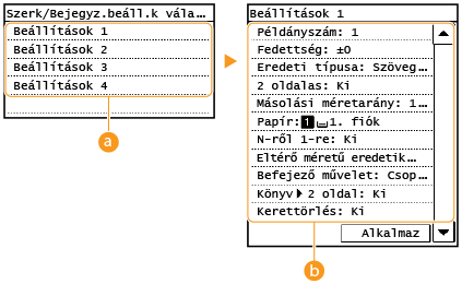 Legfeljebb négy gyakran használt másolásbeállítás-kombinációt tárolhat. Szükség esetén elegendő kiválasztania egy tárolt kombinációt, így nem lesz szükség ugyanazoknak a beállításoknak a konfigurálására minden másolás alkalmával; így például ha Ön a példányszámot gyakran 5-re állítja be, állítsa a <Kerettörlés> funkciót <Be> értékre, és másoláskor növelje az élességet. A beállításkombinációk a <Beállítások 1>–<Beállítások 4> menükbe jegyezhetők be.