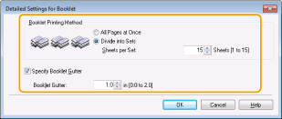 [Készletekre osztás]: A [Lap/köteg] mezőben megadott oldalszámnak megfelelően felosztva több köteget nyomtat. Az egyes kötegek külön köthetők, majd egyetlen füzetté állíthatók össze. Akkor válassza ezt a lehetőséget, ha a dokumentumnak olyan sok oldala van, amennyit nem lehetne egyetlen füzetként kötni.