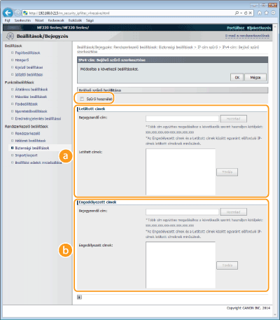 Ha helytelenül adja meg az IP-címeket, akkor előfordulhat, hogy nem fog tudni hozzáférni a készülékhez a Távoli felhasználói felületről, amely esetben az <IPv4-címszűrés> vagy az <IPv6-címszűrés> beállítását <Ki> értékre kell állítani. IPv4-címszűrés IPv6-címszűrés