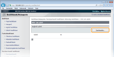 Az MAC-cím szűrőbeállításai a Főképernyőn a <Menü> használatával engedélyezhetők vagy tilthatók le. MAC-cím szűrő