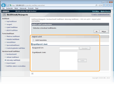 ![]() Beviteli hibák ellenőrzése Ha helytelenül adja meg az MAC címeket, akkor előfordulhat, hogy nem fog tudni hozzáférni a készülékhez a Távoli felhasználói felületről, amely esetben a <MAC-cím szűrő> beállítását <Ki> értékre kell állítani. MAC-cím szűrő