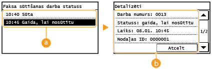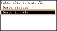 ![]() <Faksa sūtīšanas darba statuss>/<Faksa saņemšanas darba statuss>Parāda to dokumentu sarakstu, kas tiek nosūtīti, saņemti vai gaida apstrādi.