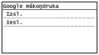 Google mākoņdruka ir pakalpojums, kas ļauj lietotājam, kuram ir Google konts, drukāt no lietojumprogrammām, piem., Google dokumenti™ vai Gmail™, izmantojot viedtālruni, planšetdatoru vai datoru, kurā ir izveidots savienojums ar internetu. Atšķirībā no parastas drukāšanas no datora Google mākoņdruka ļauj drukāt, neizmantojot printera draiveri. Piem., ja vēlaties drukāt e-pasta ziņojumu vai tam pievienotus failus, varat tos drukāt, vienkārši izmantojot Gmail mobilajām ierīcēm. Izdrukas atradīsit iekārtā.