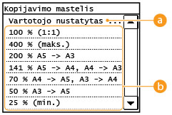Galite padidinti arba sumažinti kopijas naudodami iš anksto nustatytą kopijavimo mastelį, pvz., <A5> → <A4>, arba nustatyti pasirinktinį kopijavimo mastelį 1 % intervalais.