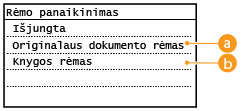 Funkcija <Rėmo panaikinimas> neprieinama naudojant <Skirtingo formato origin. dok.>, <2 ant 1>/<4 ant 1> arba <ID kortelės kopija>.