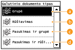 Jei ruošiate kelias kelių lapų dokumentų kopijas, galite pasirinkti nukopijuotų lapų tvarką <Grupė>, <Rūšiavimas>, <Pasukimas ir grupė> arba <Pasukimas ir rūšiavimas>. Ši funkcija naudinga ruošiant padalomąją medžiagą susitikimams arba pristatymams.