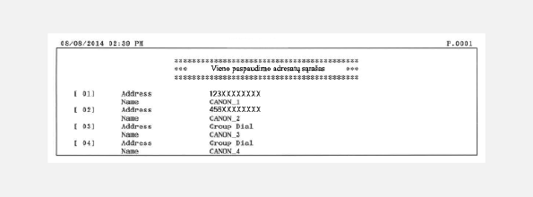 Išspausdinę adresų knygelės sąrašą galite tikrinti adresatų, adresų knygelėje užregistruotų kaip <Kodinio paspaudimo numeris>, <Vieno paspaudimo> ir <Grupės nr. rinkimas>, sąrašą.