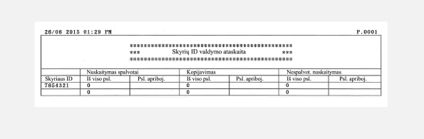 Įjungus Skyriaus ID valdymo funkciją, galite išsispausdinti ataskaitą ir patikrinti bendrą kiekvienam Skyriaus ID nukopijuotų, išspausdintų, nuskaitytų puslapių skaičių. Šiomis ataskaitomis galima stebėti naudojimą ir pagerinti valdymą.
