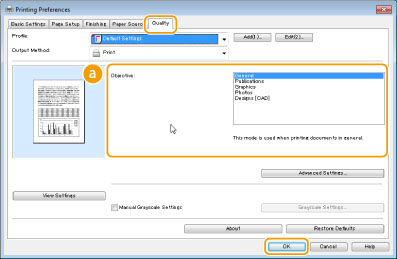 Norėdami nurodyti kiekvieno dalyje [Objective] (Tikslas) pasirinkto elemento išsamius parametrus, spustelėkite [Advanced Settings] (Papildomi parametrai). Jei reikia daugiau informacijos, spausdintuvo tvarkyklės ekrane spustelėkite [Help] (Žinynas).