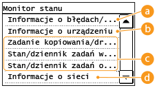wyświetlony zostaje ekran umożliwiający sprawdzenie statusu drukowanych, wysyłanych lub otrzymywanych dokumentów, a także stanu maszyny np. poziomu toneru w zasobnikach lub danych na temat ustawień sieciowych, np. ustawień adresu IP urządzenia.