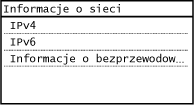 Umożliwia wyświetlenie ustawień sieciowych, np. ustawień adresu IP urządzenia, oraz stanu sieci, np. poprawności działania bezprzewodowej komunikacji LAN.