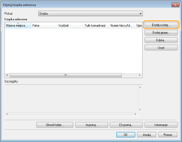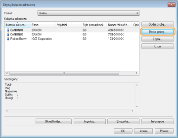 W tym rozdziale przedstawiono instrukcje zapisywania odbiorców w książce adresowej do wysyłania faksów z komputera. Dostępna jest funkcja tworzenia grupy odbiorców (Wybieranie grupowe) z poszczególnych odbiorców zapisanych w książce adresowej. Funkcja ta jest przydatna w przypadku wysyłania do wielu odbiorców jednocześnie.