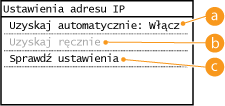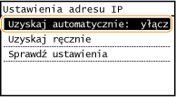 ![]() ![]() Aby adres IP nie był przypisywany za pomocą protokołu DHCP/BOOTP/RARP Wybierz pozycję <Wyłącz>. Jeśli wybrana zostanie opcja <DHCP>, <BOOTP> lub <RARP>, w przypadku gdy usługi są niedostępne, urządzenie będzie traciło czas i zasoby komunikacyjne na wyszukiwanie tych usług w sieci. |
