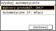 ![]() Jeśli na ekranie wyświetlona jest opcja <Włącz>, dotknij elementu <Uzyskaj automatycznie>, a następnie nadaj ustawieniom <Wybierz protokół> i <Autom. IP> wartość <Wyłącz>.