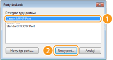W obszarze [Available port types] (Dostępne rodzaje portów) zaznacz port [Canon MFNP Port] i kliknij polecenie [New Port] (Nowy port).