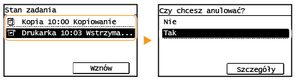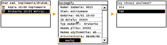 Anulowanie z poziomu Zdalnego interfejsu użytkownikaWydruk można anulować na stronie [Drukuj: Stan zadania] w Zdalnym interfejsie użytkownika: Sprawdzanie bieżącego stanu drukowanych dokumentów