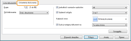 Kliknij zakładkę [Print Settings] (Ustawienia wydruku), aby wyświetlić ekran umożliwiający konfigurację ustawień drukowania takich jak liczba kopii oraz funkcja drukowania 1-stronnego/2-stronnego. Określone tutaj ustawienia mają zastosowanie do całego zadania drukowania.