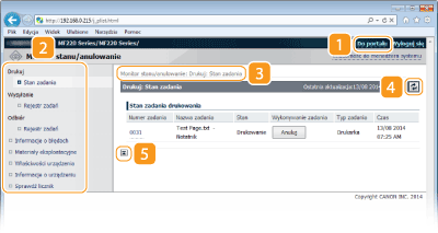Wyświetla stan aktualnie drukowanych dokumentów, historię wydruku, kopiowania oraz wysyłania, a także otrzymane dokumenty. Umożliwia także sprawdzenie stanu urządzenia.