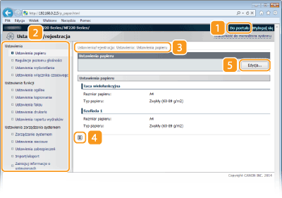 Wyświetla stronę [Ustawienia/rejestracja]. Po zalogowaniu się w trybie menedżera systemu można zmienić elementy ustawień i zapisać lub załadować zarejestrowane dane.