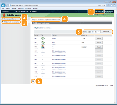 Wyświetla numery wybierania kodowego zapisane w książce adresowej. Rejestracja lub edycja zawartości książki adresowej jest możliwa po zalogowaniu się w trybie menedżera systemu.