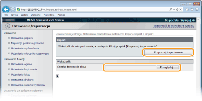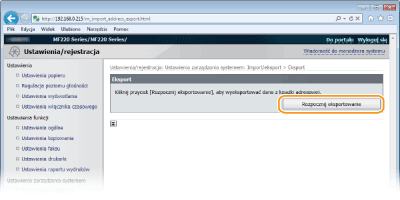 Dane książki adresowej urządzenia można zapisać na komputerze (eksportować). Dane zapisane na komputerze można zarejestrować w urządzeniu (importować). Z łatwością można kopiować odbiorców w książce adresowej do wielu urządzeń.* Aby korzystać z tych funkcji, wymagane jest zalogowanie się do trybu menedżera systemu.