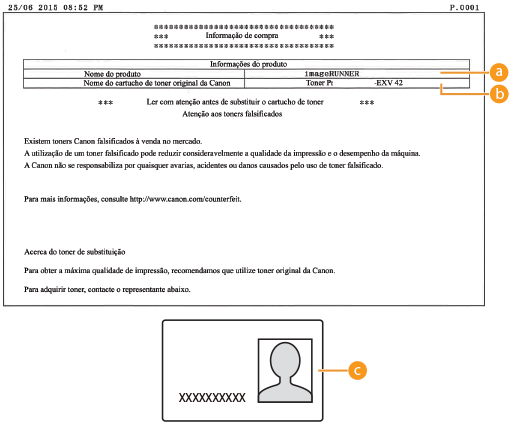 Especifique a impressão da informação de compra para consumíveis. São impressos os seguintes itens: